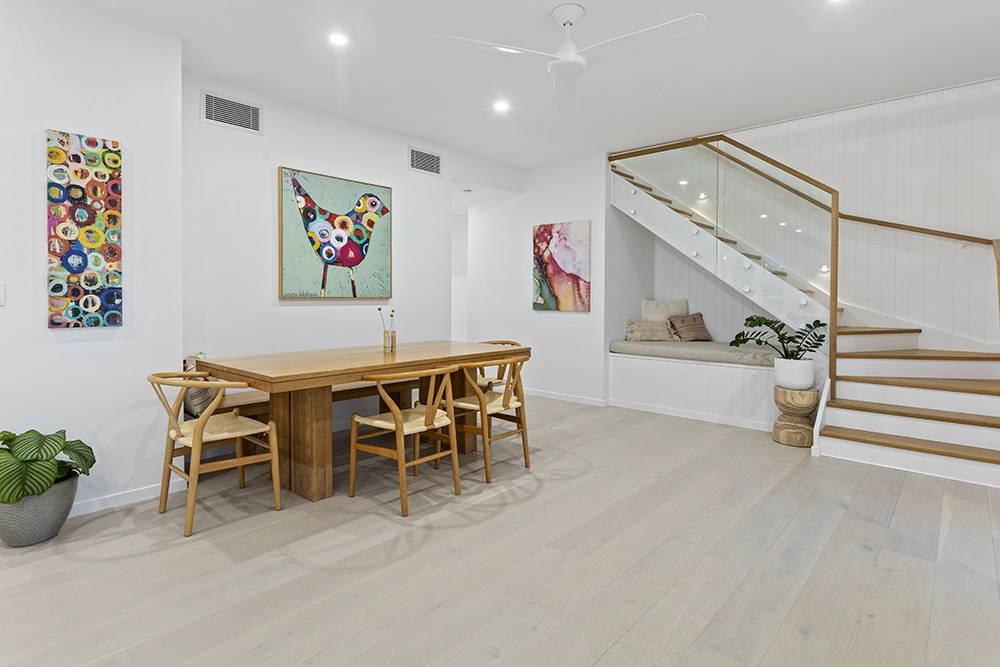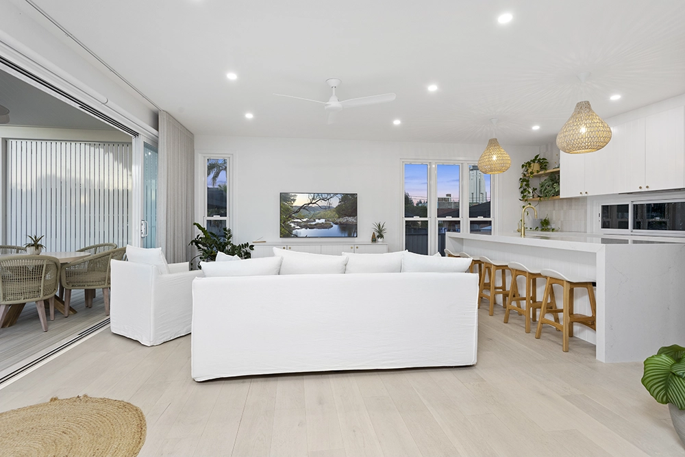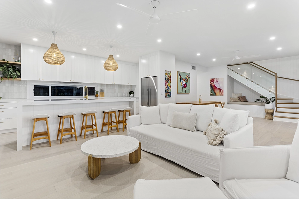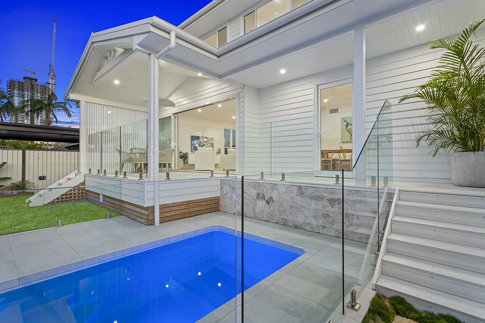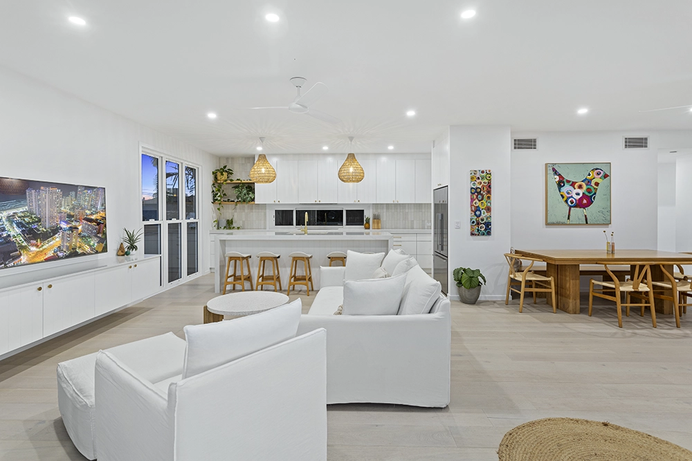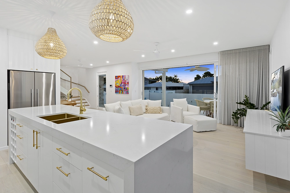The Burleigh Duplex, located in serene Burleigh Waters, blends modern luxury with laid-back elegance. Designed by Studio 72, it features seamless indoor-outdoor living, a pool and BBQ area perfect for entertaining, and an open-plan living space that flows into a well-appointed kitchen with a butler’s pantry. The luxurious master suite offers a private retreat, while additional bedrooms and a games room provide ample family space. The Burleigh Duplex embodies coastal living at its finest.