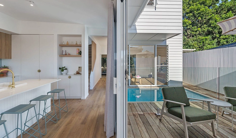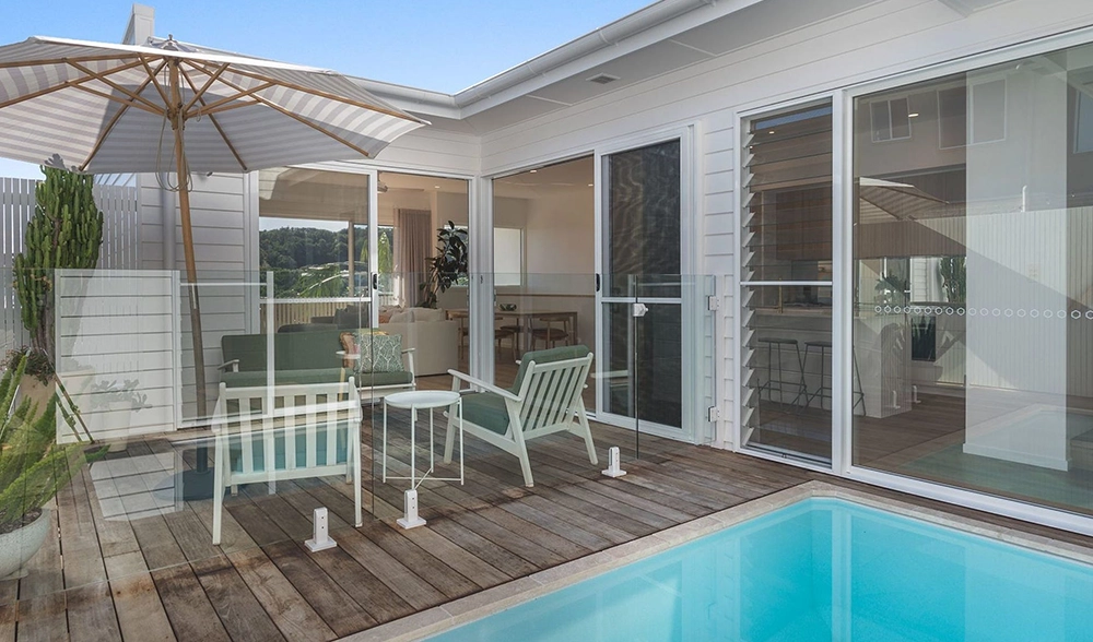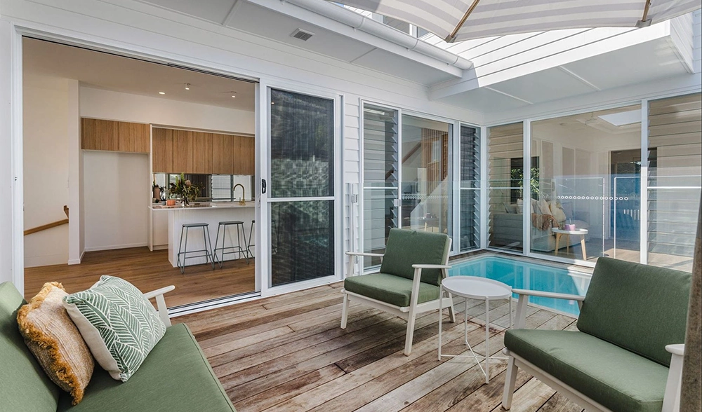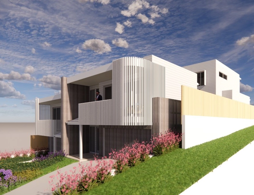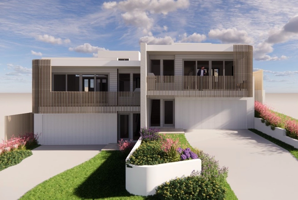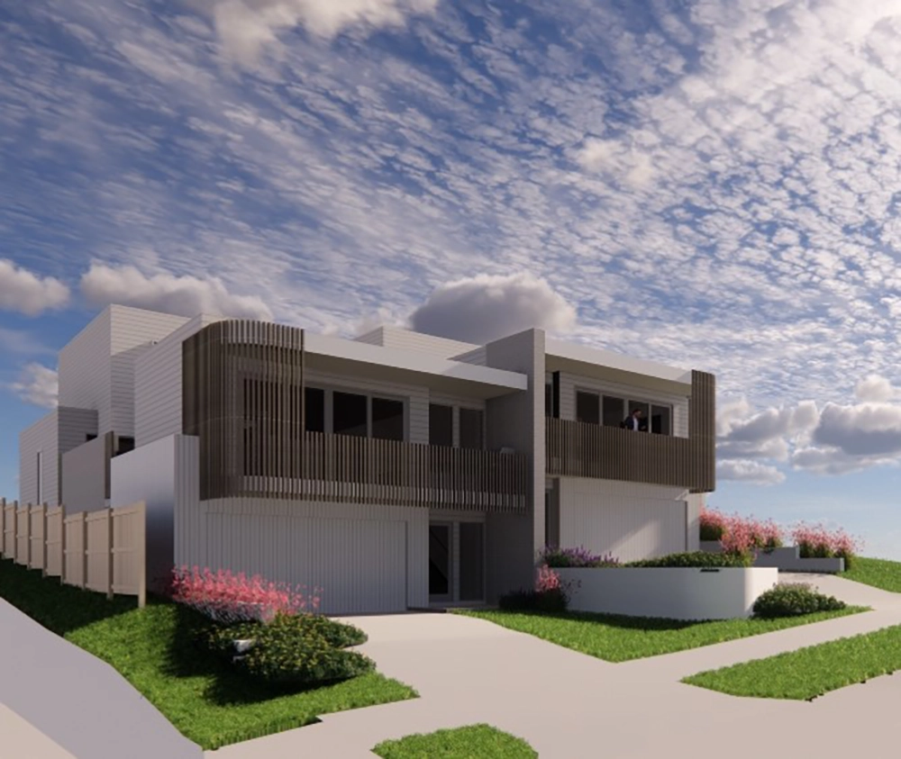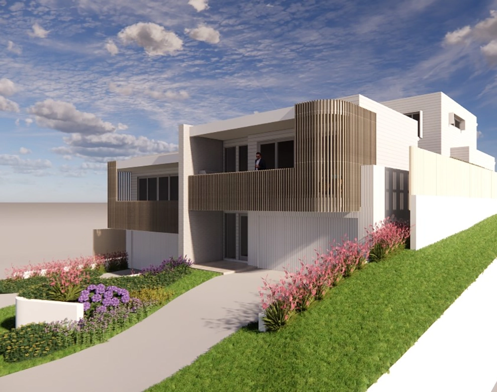 The site presented challenges with a dual slope, both front-to-back and side-to-side. Due to the proximity of surrounding homes, Studio 72 incorporated a plunge pool into the central courtyard of each unit. The design embraces a coastal style, harmonising with the surrounding environment. The image to the right is the type of 3D image and model produced at each stage.