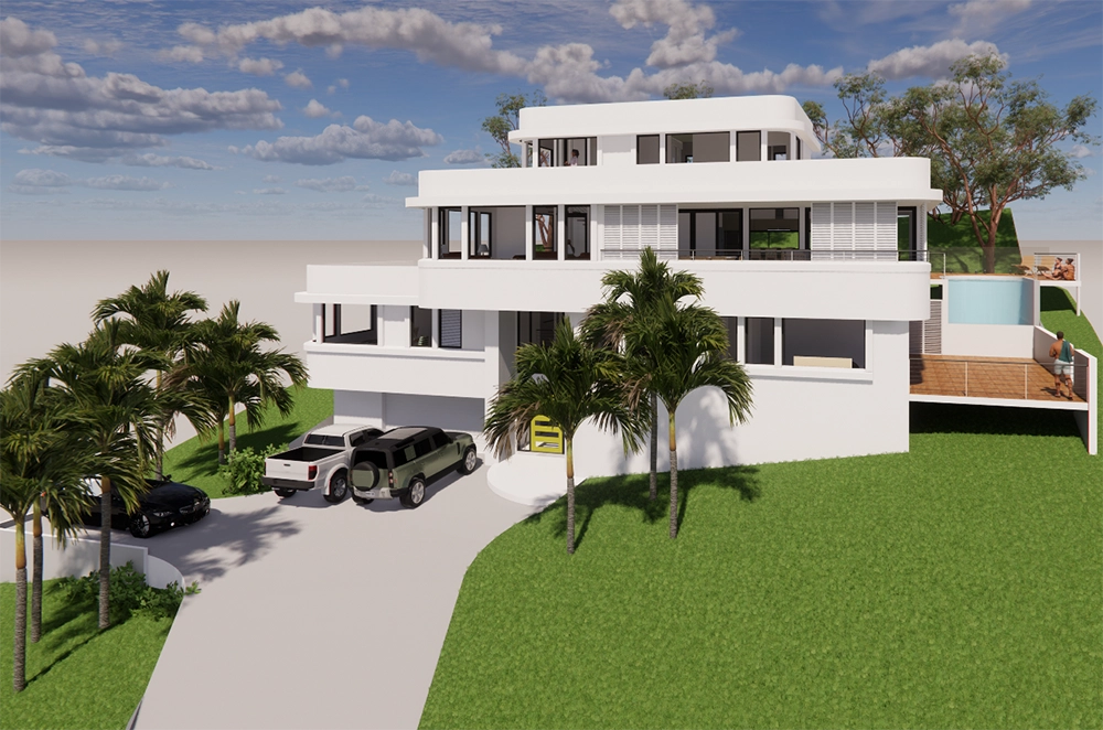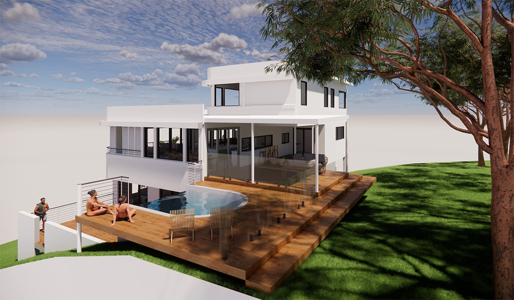 The result is a striking multi-level home defined by its sculptural white forms, sweeping decks, and resort-inspired outdoor entertaining terrace with feature pool. Inside, flexible living areas and private retreats flow seamlessly across the levels, with the top pavilion offering elevated views and a true sense of escape.